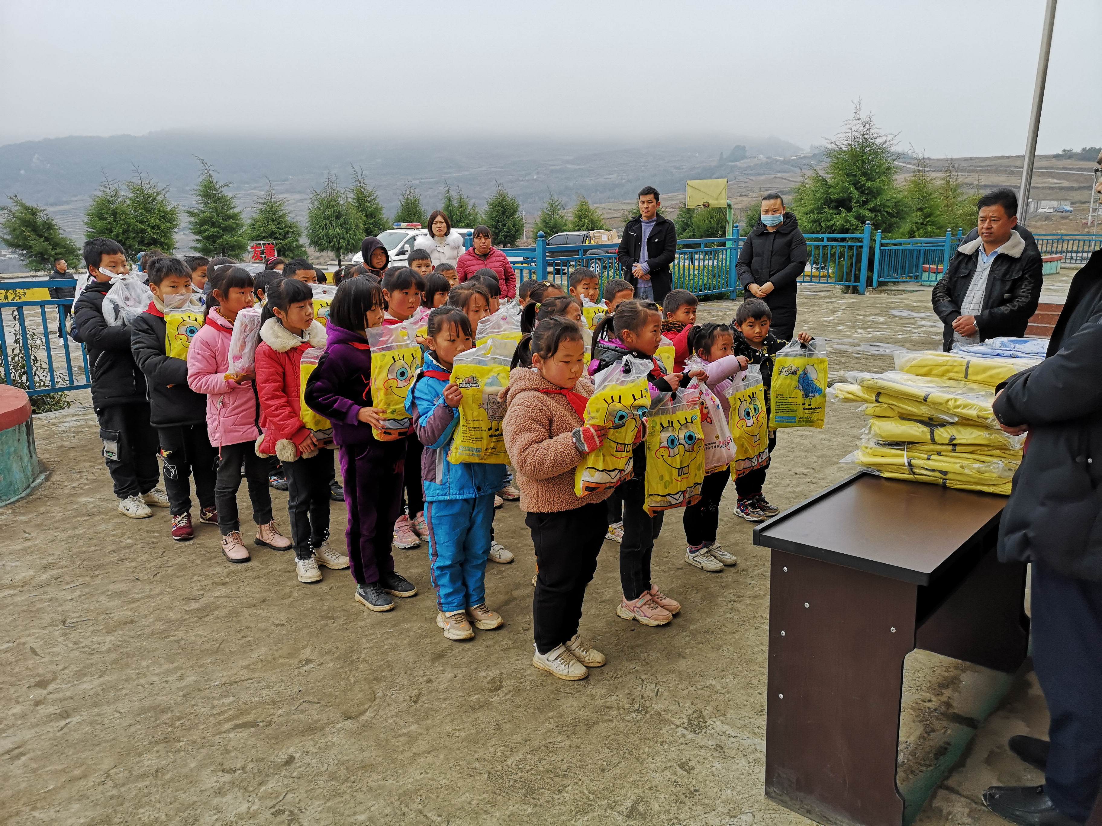 法治教育后,现场为在校学生发放了800套书包和保暖鞋,让严冬的“花儿”们在爱与法的温暖中茁壮盛开。