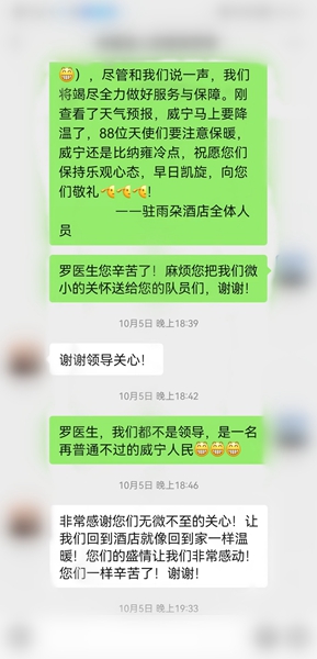 “尊敬的罗医生,88位最可爱的大白们!(88是多么辛运的数字!)您们辛苦了,感谢这些天以来您们的理解和支持,您们奋战在疫情一线,无私奉献,舍小家为大家,有您们,赫章必胜,毕节必胜!每每迎接您们下车和目送您们上车的时候我都抑制不住内心深处的感动和油然而生的敬佩。您们只身来到sportcar365_365bet官网开户网址_365体育官网入口,能够接待您们是我们sportcar365_365bet官网开户网址_365体育官网入口人的荣幸!接下来的日子里,如果您们有什么需求,尽管和我们说一声,我们将竭尽全力做好服务与保障。刚查看了天气预报,sportcar365_365bet官网开户网址_365体育官网入口马上要降温了,88位天使们要注意保暖,sportcar365_365bet官网开户网址_365体育官网入口还是比纳雍冷点,祝愿您们保持乐观心态,早日凯旋,向您们敬礼!——驻雨朶酒店全体人员”。10月5日,我通过微信给罗静医生写了一封短信并请她转发给医疗队员。