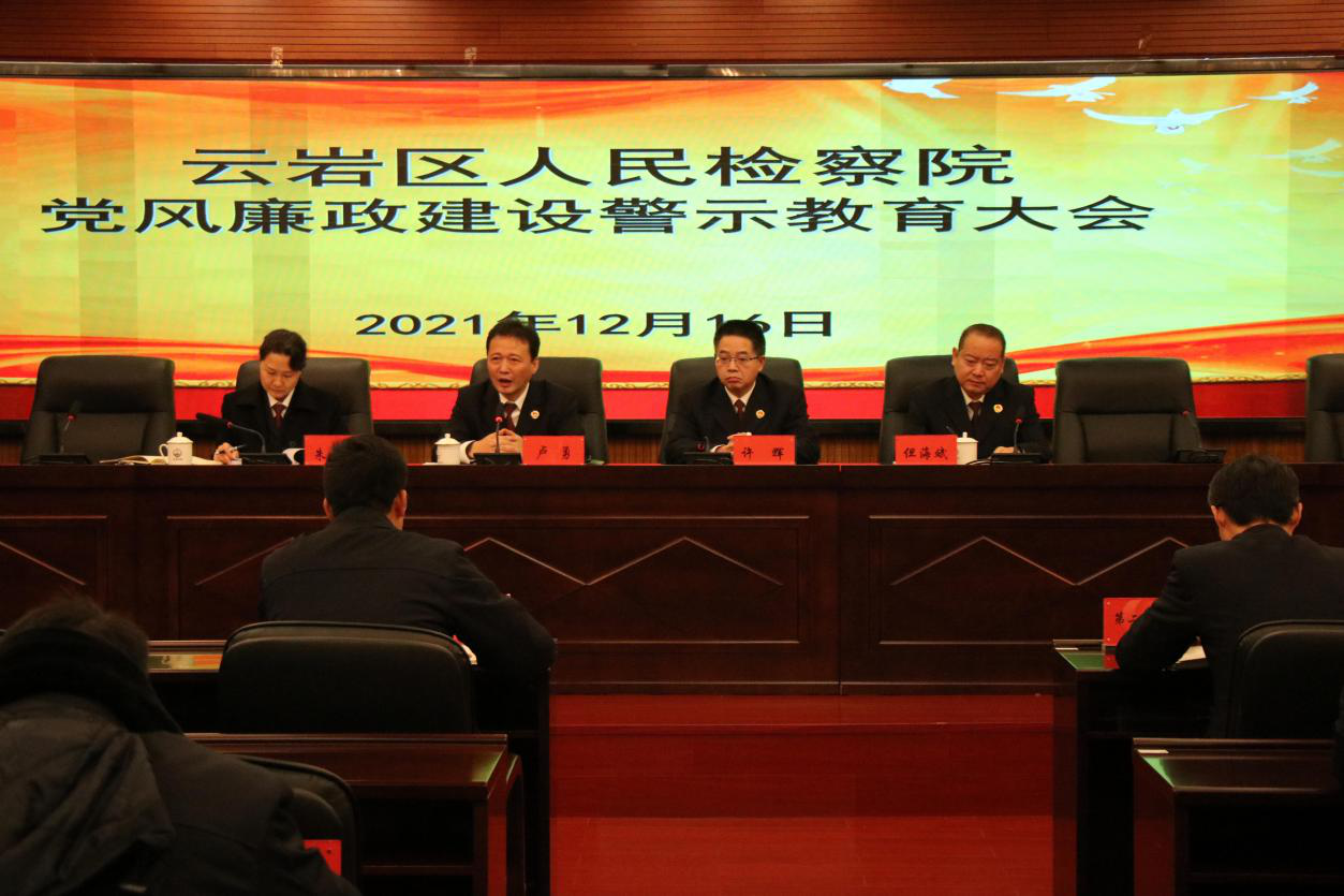 云岩区人民检察院根据省纪委监委办公厅《关于深入推进“以案促案”工作的指导意见》要求,进一步压紧压实全面从严管党治党的政治责任,切实强化检察人员教育与监督管理,充分发挥违纪违法案反面典型警示作用,深化检察队伍教育整顿成效,2021年12月16日下午,云岩区人民检察院组织召开党风廉政建设警示教育大会。