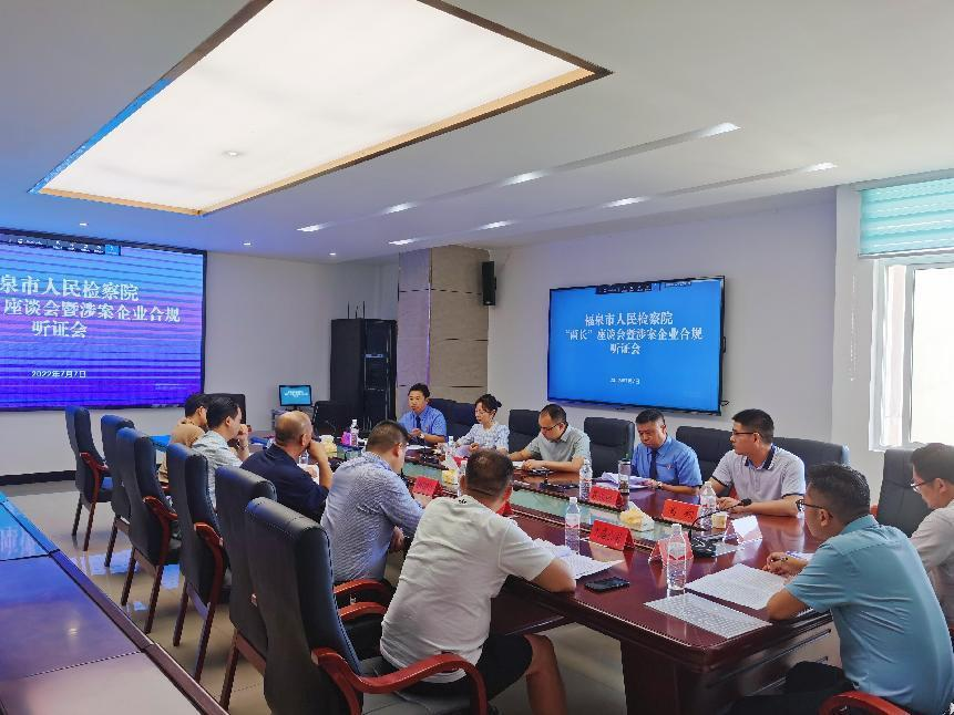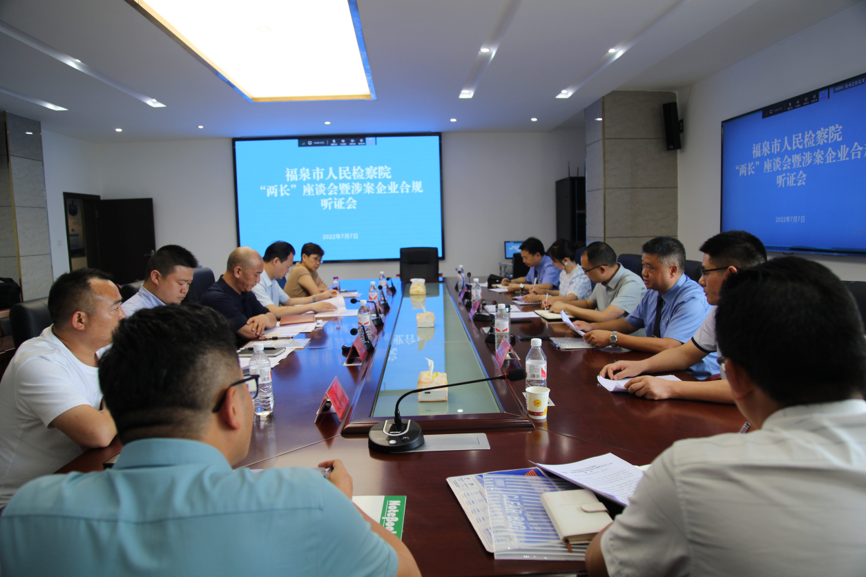 近日,福泉市检察院召开“两长”座谈会暨涉案企业合规听证会,黔南高新区、市法院、市工商联等单位主要负责同志及听证员、受邀企业代表、涉案企业代表参加会议。