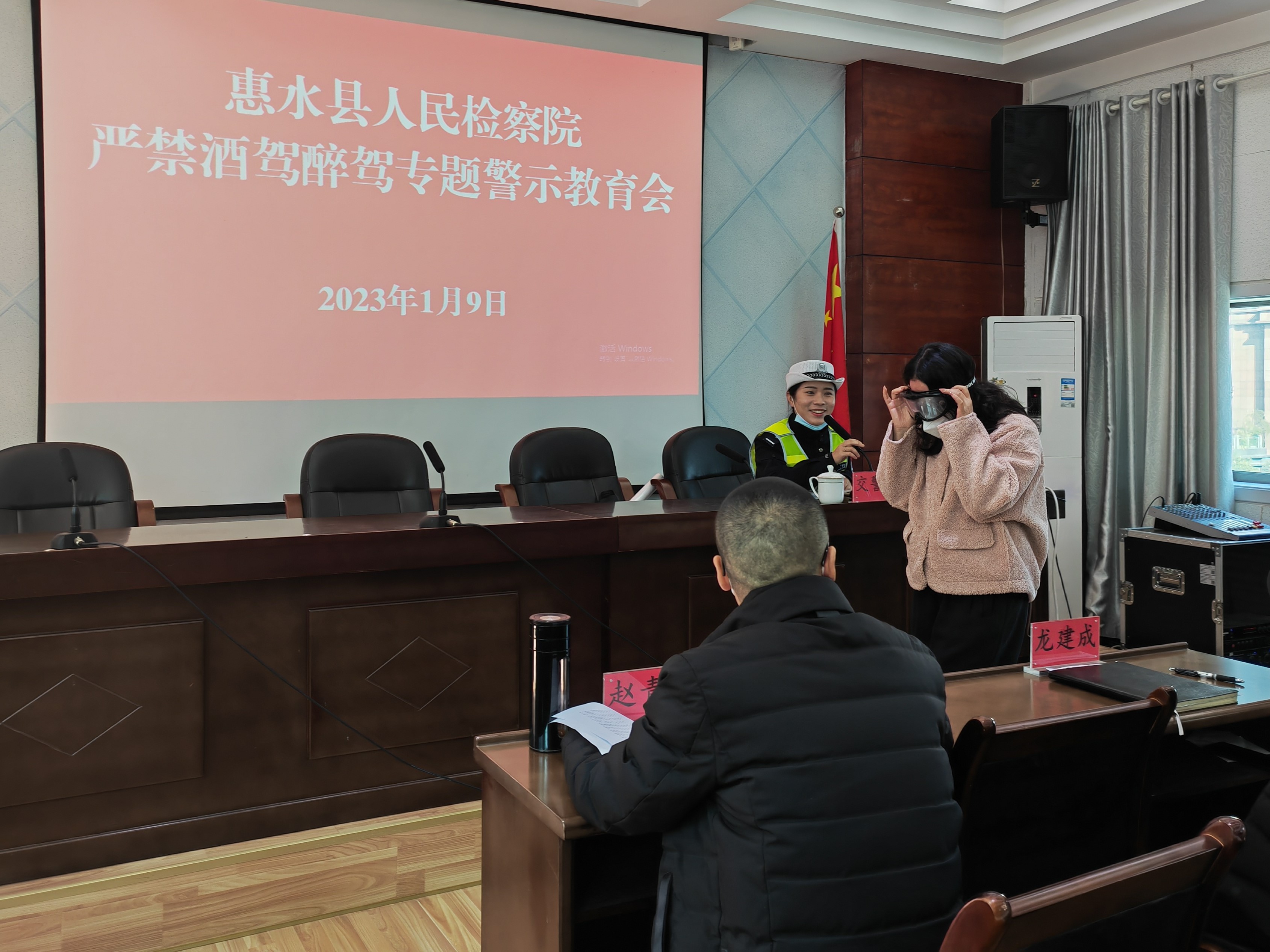 会议邀请了县公安局交警大队同志作了交通安全警示教育培训。警示教育中,授课警官结合典型事故案例,详细讲解了道路交通安全知识,介绍了危险驾驶罪等相关法律法规,重点强调了酒驾醉驾的危害性,现场还发放了杜绝酒驾醉驾宣传单。特别是干警配戴酒驾模拟眼镜的现场实验、涉酒驾驶致人死亡交通事故案例、党员公职人员酒驾醉驾典型案例等内容,充分展现了酒驾醉驾严重危害社会治安和人民群众生命健康、损害党员干部和公职人员形象的严重后果,也警醒广大检察干警和党员干部要提高思想认识,不能抱存侥幸心理,要时刻保持清醒头脑、增强自律意识,养成文明驾驶习惯。