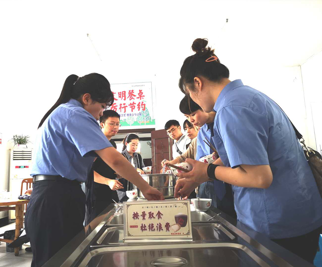 镇远县人民检察院职工食堂内,“按量取食、杜绝浪费!”的提示牌,无声地提醒着用餐人员珍惜每一餐饭,节约每一粒粮。干警们排着队,自觉的按食量进行自助取餐。
