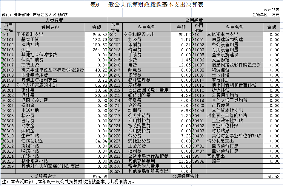 贵州省铜仁市碧江区人民检察院2017年度一般公共预算财政拨款基本支出 741.08万元,其中:人员经费675.56 万元,主要包括:基本工资132.79万元、津贴补贴159.83万元、奖金264.03万元、社会保障缴费49.22万元、伙食补助费0万元、绩效工资0万元、其他工资福利支出3.75万元、离休费10.57万元、退休费20.53万元、抚恤金万0元、生活补助0万元、医疗费0万元、奖励金0万元、住房公积金34.84万元、提租补贴0万元、购房补贴0万元、其他对个人和家庭的补助支出0万元,公用经费65.52 万元,主要包括:办公费1.57万元、印刷费0.34万元、咨询费0万元、手续费0万元、水费1.45万元、电费12.65万元、邮电费0万元、取暖费0万元、物业管理费0万元、差旅费0万元、维修(护)费4.29万元、租赁费0万元、会议费0万元、培训费6.98万元、公务接待费1.35万元、专用材料费0万元、劳务费7.23万元、委托业务费0万元、工会经费0万元、福利费0万元、公务用车运行维护费8.41万元、其他交通费用21.25万元、其他商品和服务支出0万元、办公设备购置0万元、专用设备购置0万元、信息网络及软件购置更新0万元、其他资本性支出0万元。