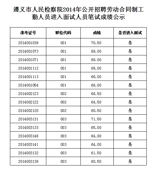 附件:遵义市人民检察院2014年公开招聘劳动合同制工勤人员进入面试人员笔试成绩公示